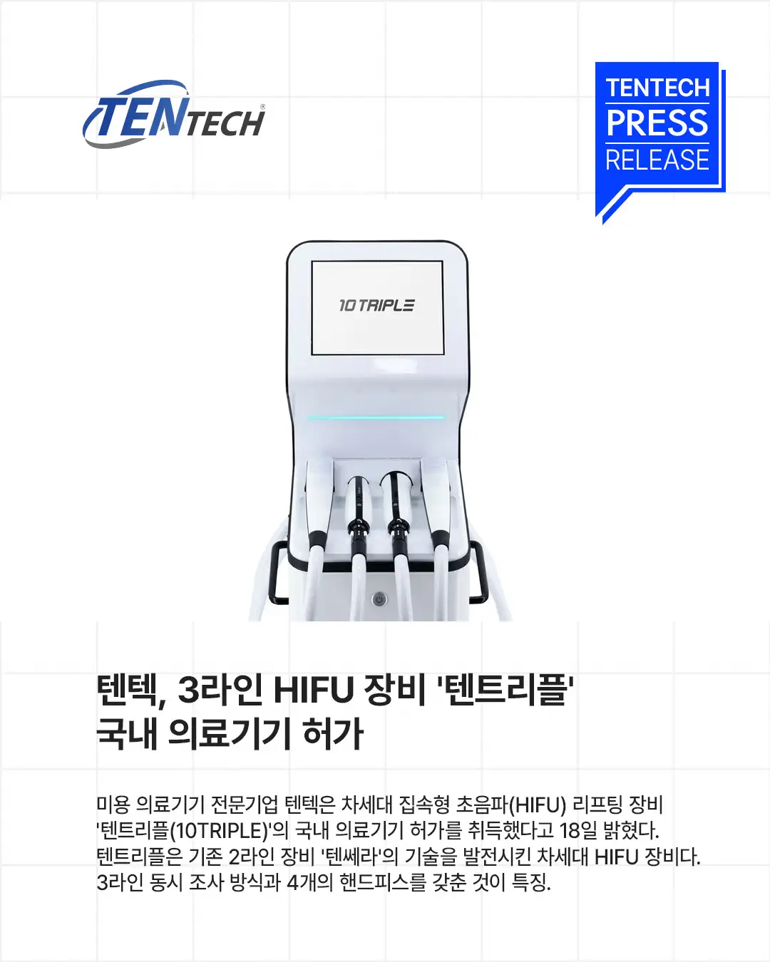 "10三重"是一款采用2线高倍辐射设备"10倍辐射"先进科技的下一代高倍辐射设备,其特点是同时采用3线辐射方法和4个手持件。 腾特科技凭借其"10泰尔玛"和"10泰尔玛"在射频和超声波起重设备市场建立了国内外的认可。特别是,"10泰尔玛"因其快速的处理时间和卓越的性能而受到赞誉。 据该公司称,'10三倍'继承了'10泰瑞'的优势,同时利用其同步三换能器辐照技术进一步提高了治疗时间。 它还通过更精确的治疗和提高便利性来增强临床环境中的易用性。 该设备共配备7种不同类型的墨盒:2种3线墨盒,2种3点墨盒(笔式)和3种1点墨盒(笔式墨盒),允许在大面积上快速处理,在狭窄区域进行精确处理。 特别是,三线和笔式墨盒显著缩短了治疗时间。 产生的能量可以到达真皮层和表面肌肉神经系统,而不会损伤皮肤表面,从而诱导胶原蛋白和弹性纤维再生,达到提拉效果。 腾特科技的目标是到今年年底在国内生产超过300台,并在明年在全球范围内生产超过1,000台。 该公司正在亚洲、欧洲和中东的主要市场获得全球批准,同时已经与台湾、香港、印度尼西亚和越南的合作伙伴签订了合同。 该公司通过加强市场营销活动,如参与国际美学展览等,依托通过"10泰尔玛"和"10泰尔玛"建立的全球分销网络和品牌认知度,来拓展其业务范围。 此外,该公司已选定女演员高贤贞作为其新的品牌大使,以加强包括"十倍"在内的高端品牌。通过电视广告和线上线下活动,该公司旨在提高品牌知名度并提升企业价值,为首次公开募股做准备。 腾特科技是一家专注于超声波和射频医疗美容设备的全球制造商,拥有多样化的产品组合,包括"10泰尔玛"、"10泰尔玛"和"10泰尔玛"。特别是,"10泰尔玛"的目标销量超过1。今年国内外共生产了000台,并预计明年通过向巴西和泰国等主要吊装市场出口,其增长将超过一倍。 |